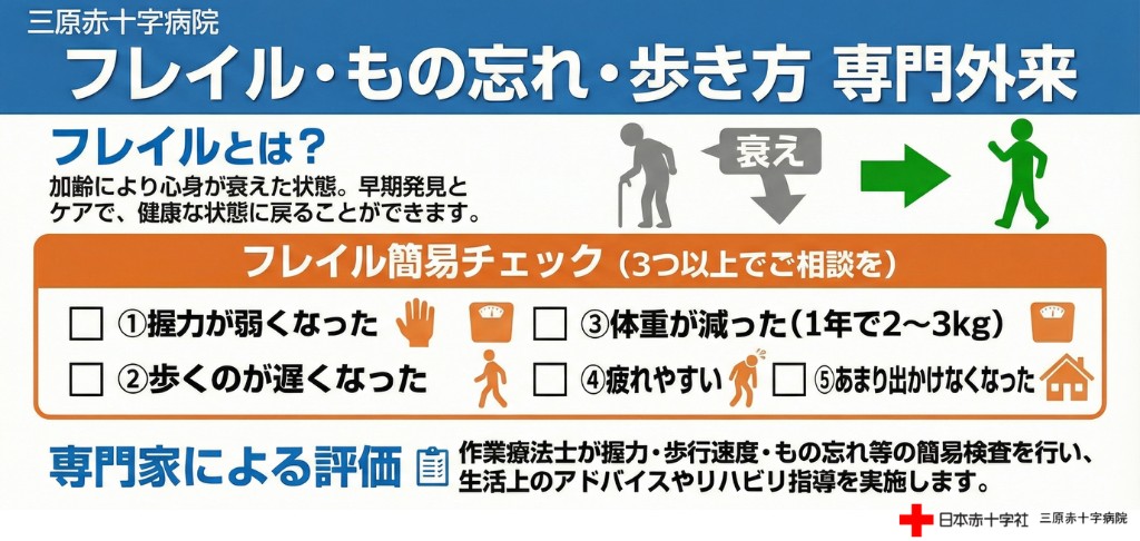 詳細については、こちら(フレイル・もの忘れ・歩き方専門外来)のページをご確認ください。